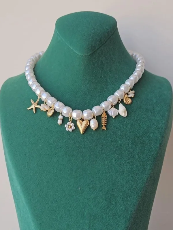 Çelik İncili Kalp İstiridye Charmlı Kolye
