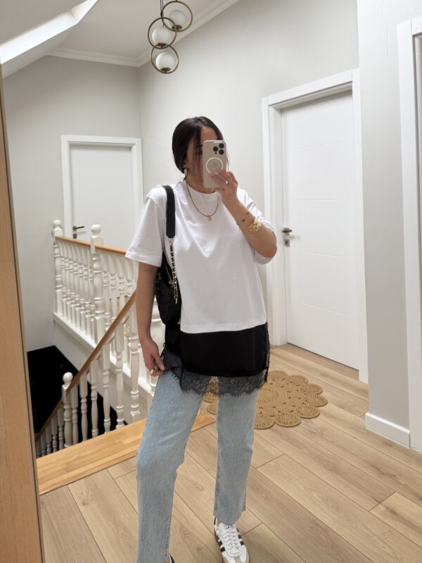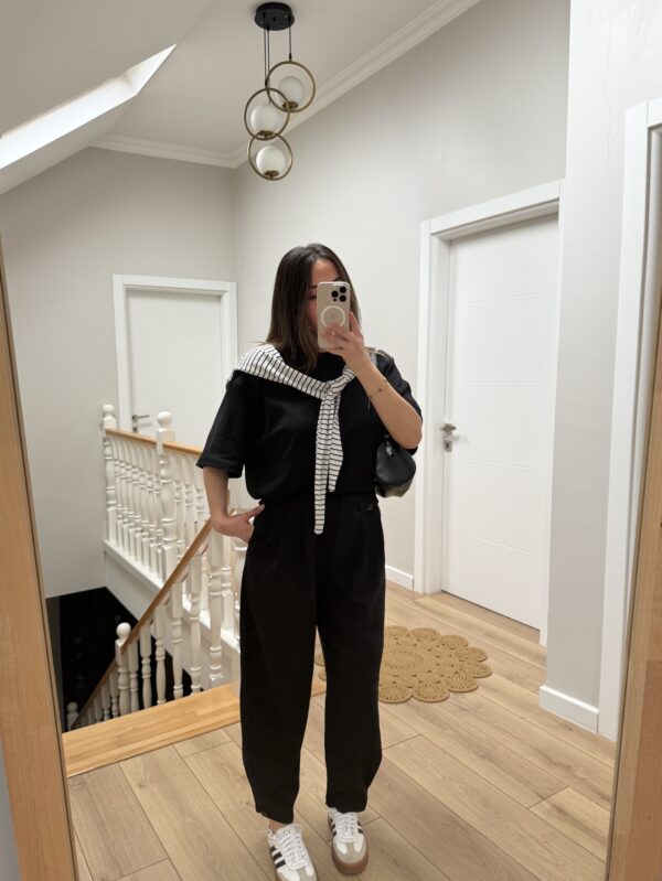 Siyah Beyaz Çizgili Şal Bağlama Detaylı Tişört