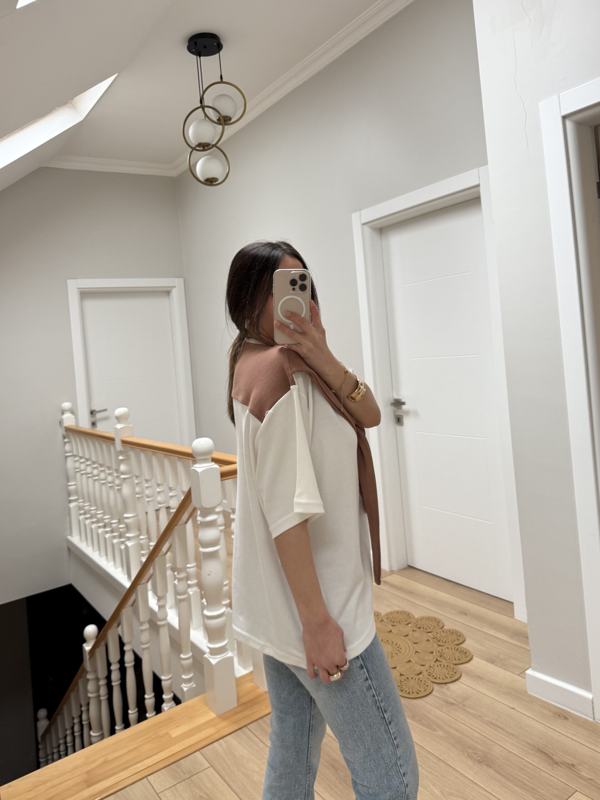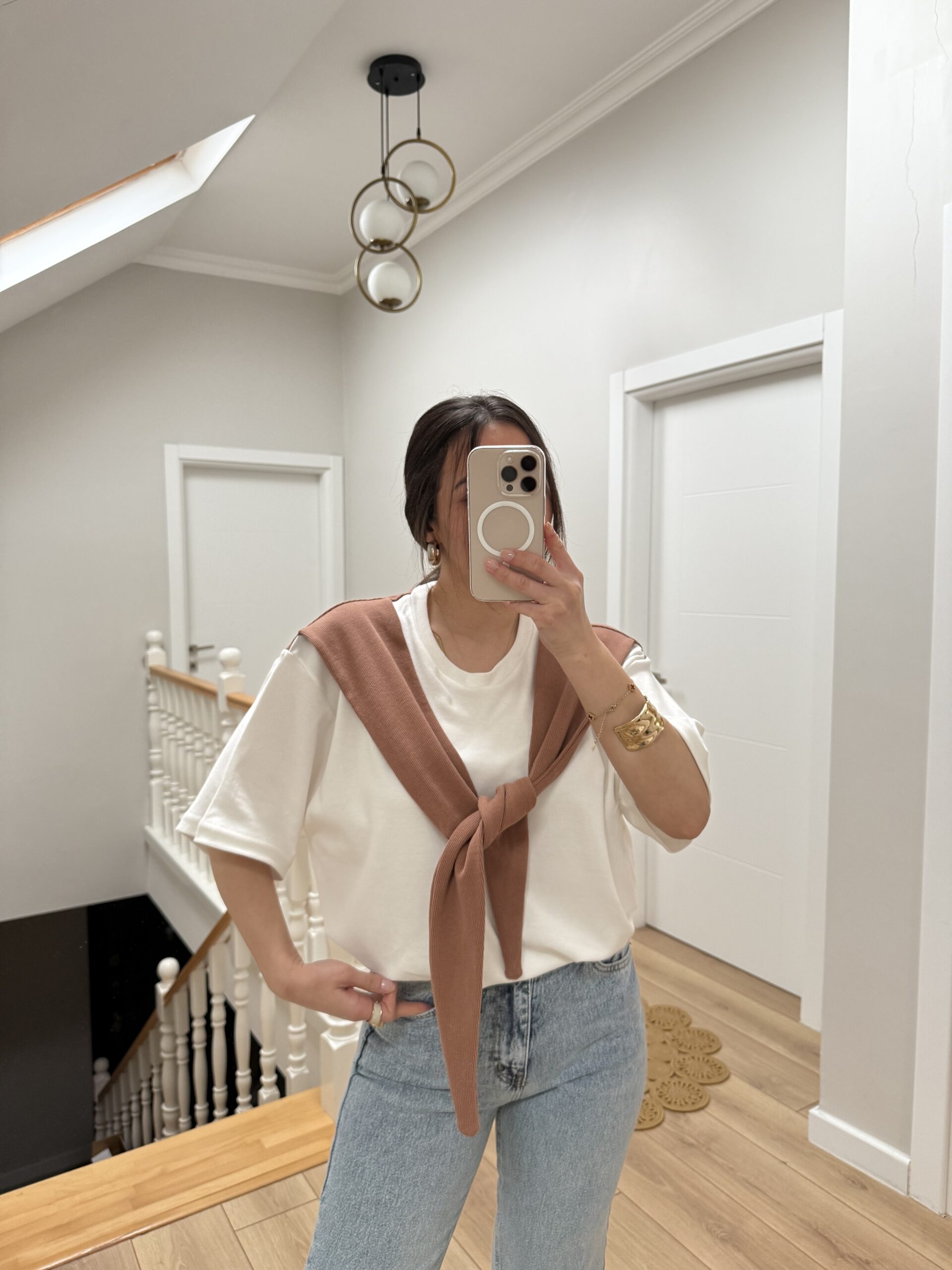 Beyaz Kiremit Renk Çizgili Şal Bağlama Detaylı Tişört