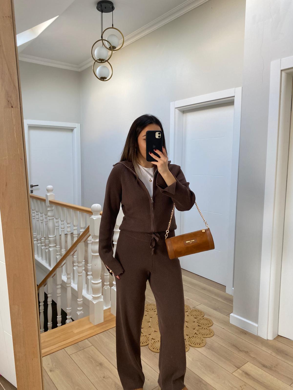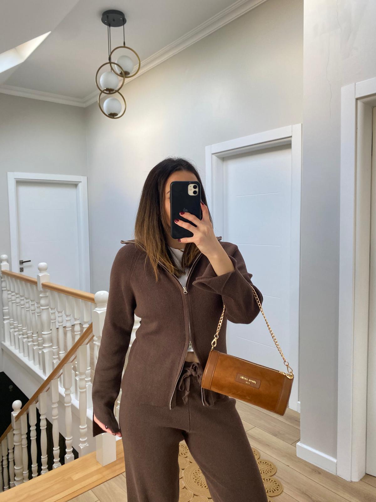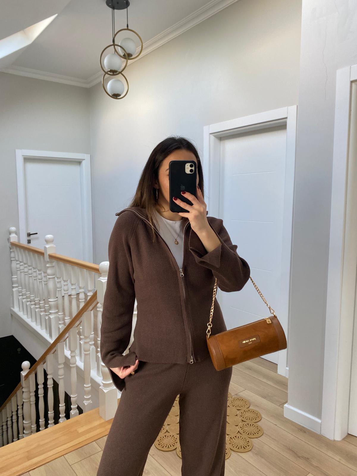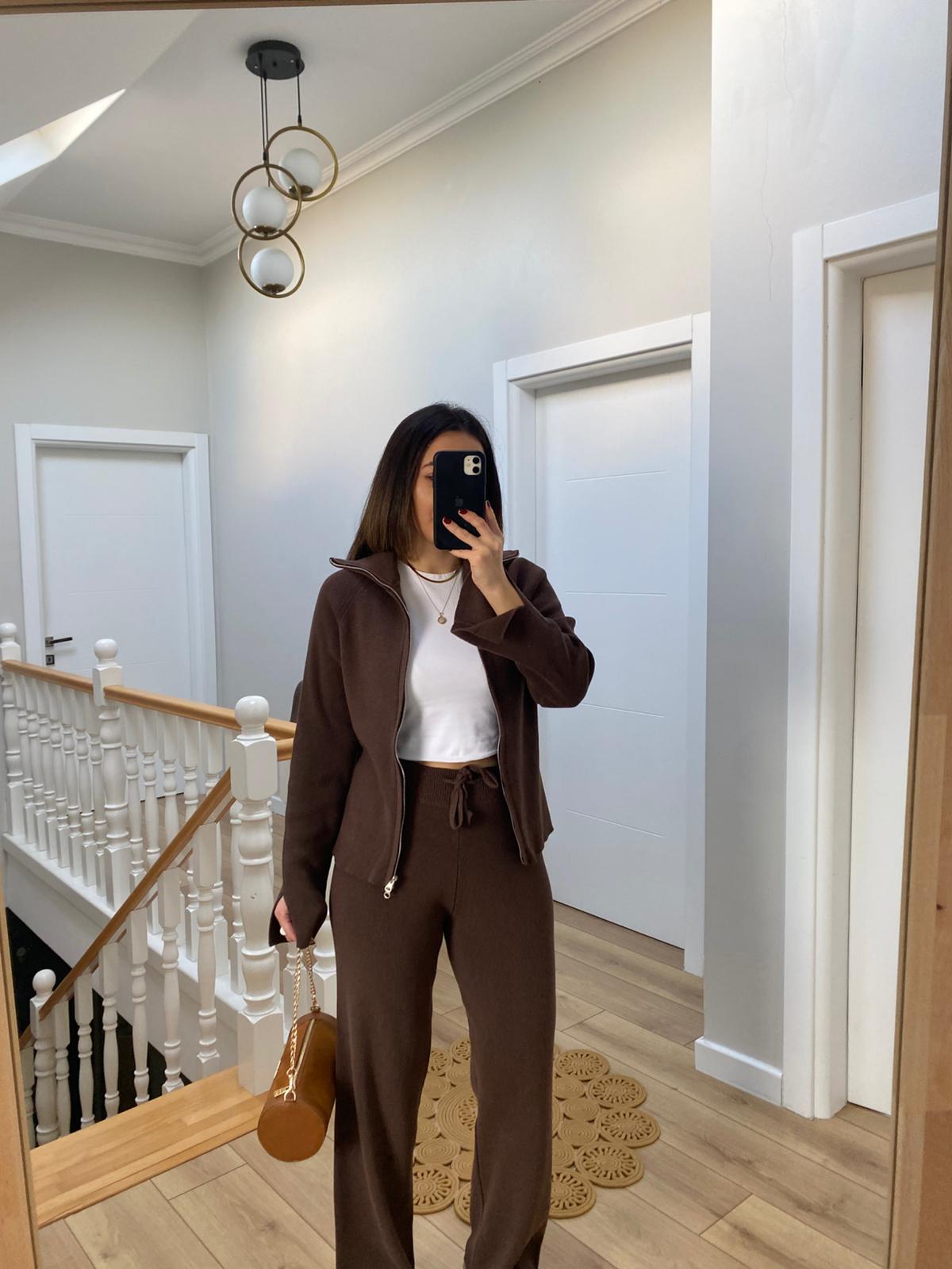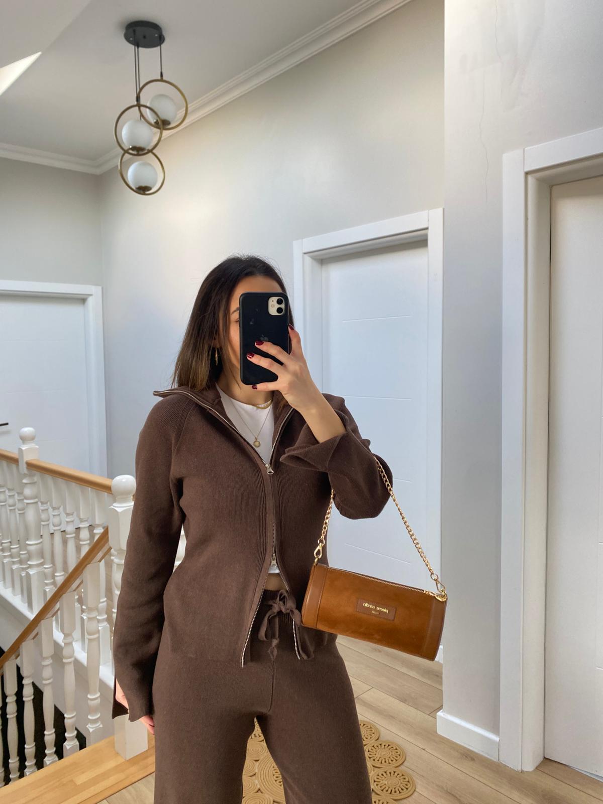 Çift Fermuarlı Belden Oturtmalı Triko Takım Kahverengi